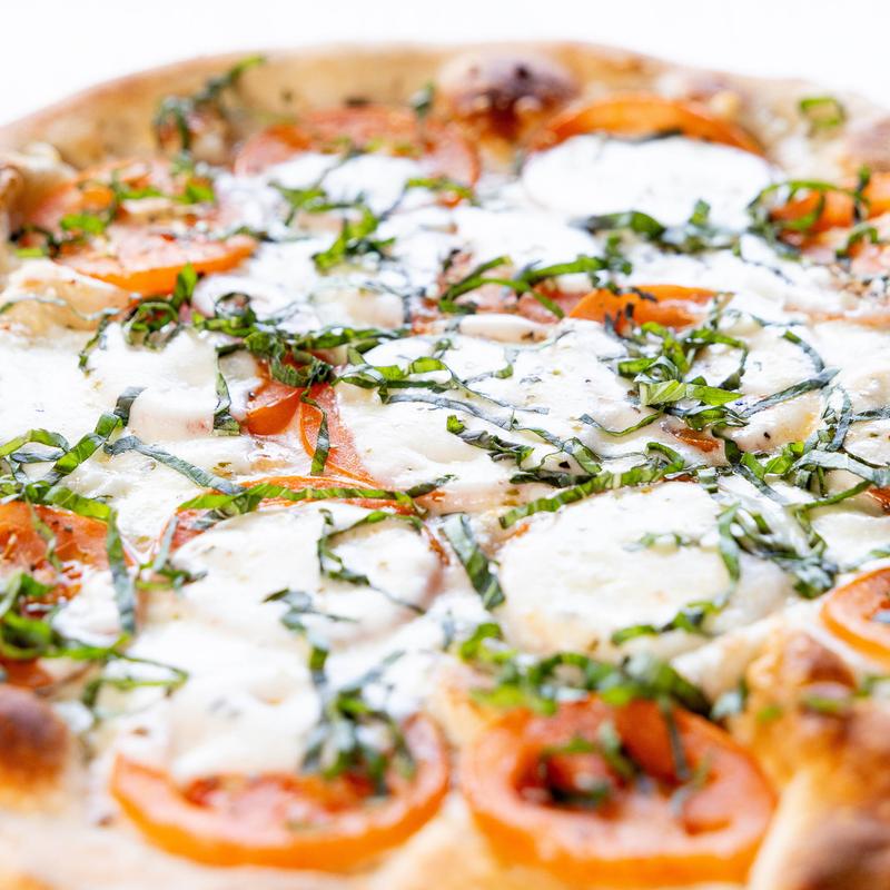 10-inch $11.00 | 12-inch $16.00 | 16-inch $21.00 • White pie, fresh garlic, olive oil, sliced tomato, fresh mozzarella cheese, topped with fresh basil.